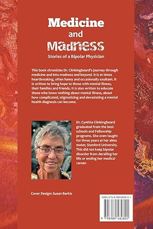 This book chronicles Dr. Cynthia Clinkingbeard’s journey through medicine and into madness and beyond. It is at times heartbreaking, often funny and occasionally exultant. It is written to bring hope to those with mental illness, their families and friends. It is also written to educate those who know nothing about mental illness about how complicated, stigmatizing and devastating a mental health diagnosis can become. Dr. Clinkingbeard graduated from the best universities and Fellowship programs. She taught for three years at her alma mater, Stanford University. Later she practiced Endocrinology in her own very successful private practice. This vocational success did not keep her from derailing her life or ending her medical career. And yet she remains resilient, forging a life of family, meaning and prosperity.
