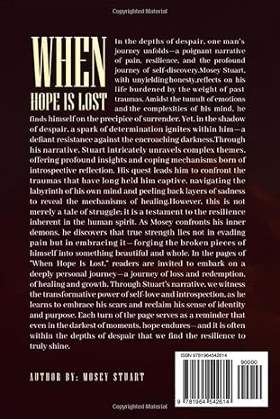 When Hope Is Lost is a journey that unravels the complexity of trauma and the effects it has on the human experience, both inwardly and through relationships. Through the resilient process of healing and understanding one’s self, this book manages to plant the seed of hope that is so often abandoned.